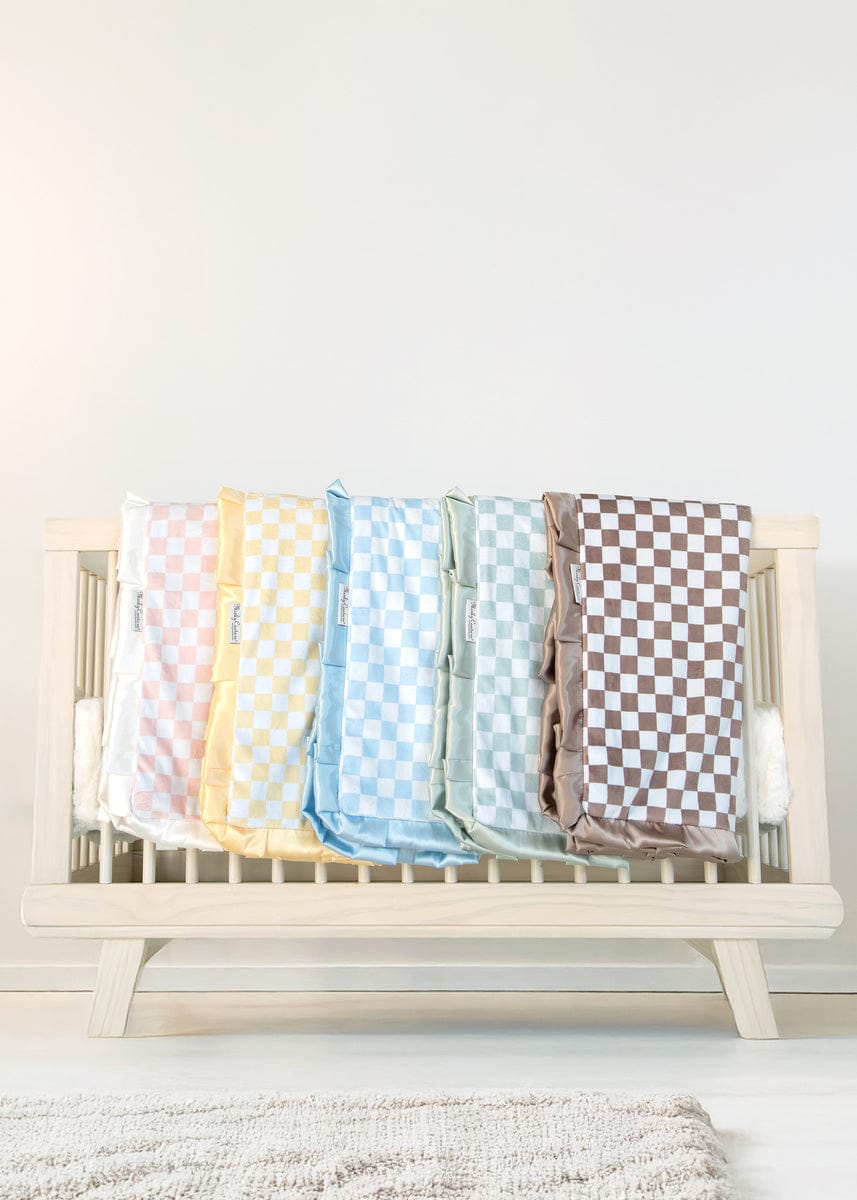 Checkered Banana showcases a classic light and dark yellow checkered pattern for a timeless look. This cozy children’s blanket is perfect for everyday snuggles and stylish nursery décor. This blanket is backed in a yellow plush minky with a yellow satin ruffle.