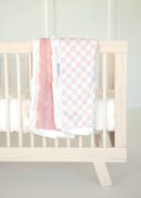 Checkered Blush showcases a classic light and dark yellow checkered pattern for a timeless look. This cozy children’s blanket is perfect for everyday snuggles and stylish nursery décor. This blanket is backed in a blush pink plush minky with a cream satin ruffle.