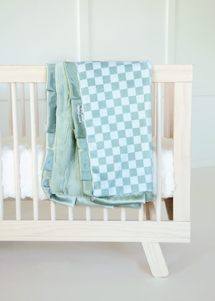Checkered Cactus showcases a classic light and dark yellow checkered pattern for a timeless look. This cozy children’s blanket is perfect for everyday snuggles and stylish nursery décor. This blanket is backed in a green plush minky with a green satin ruffle.