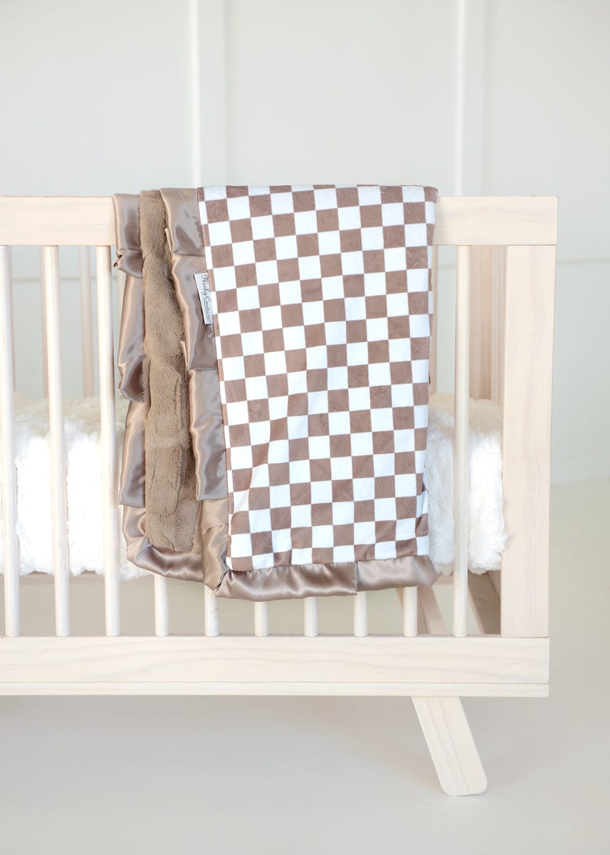 Checkered Milk Chocolate showcases a classic light and dark yellow checkered pattern for a timeless look. This cozy children’s blanket is perfect for everyday snuggles and stylish nursery décor. This blanket is backed in a brown plush minky with a brown satin ruffle.