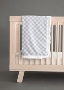Checkered Silver showcases a classic light and dark gray checkered pattern for a timeless look. This cozy children’s blanket is perfect for everyday snuggles and stylish nursery décor. This blanket is backed in a silver plush minky with a cream satin ruffle.