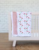 The Cheery Cherry blanket features bright red cherry pairs and playful pink hearts on a crisp white background, bringing a sweet and lively touch to any room. This blanket is backed in a apricot plush minky with a white satin ruffle.
