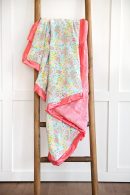 - Details: This blanket has small yellow, pink, blue and coral flowers on a white background. It is backed in a coral plush minky with a matching coral satin ruffle.