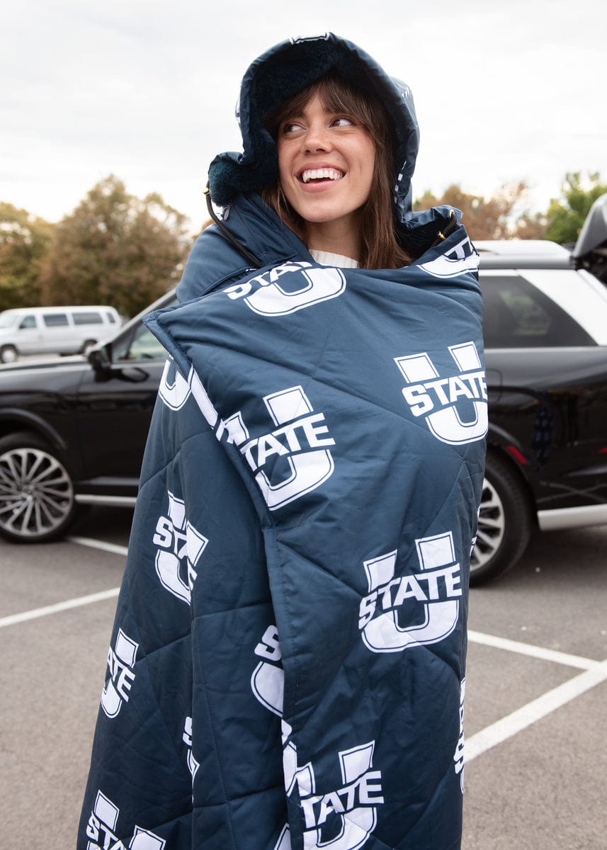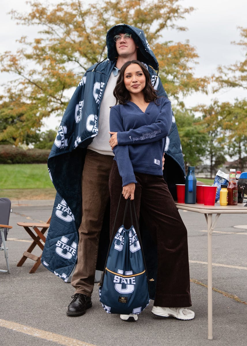 Show your Aggie pride wherever you go with the officially licensed Everywhere Blanket – Utah State Aggies. The outer lining features the iconic Utah State blue with the bold white Aggies logo, while the inside is lined with ultra-soft plush in the same signature blue for a cozy, coordinated look. Perfect for picnics, a stadium blanket for sports games, camping, and more, this versatile outdoor blanket is designed to keep you warm while representing Utah State in style.