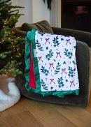 The Holly Berries Blanket is a festive favorite that brings holiday cheer to every cuddle. Featuring a crisp white background decorated with delicate bows and bright holly berries, it perfectly captures the spirit of the season. This blanket is backed in a red plush minky with a evergreen satin ruffle.