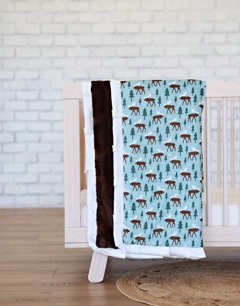 Moose features charming moose with big antlers, paired with scattered trees on a light background, creating a cozy, woodland feel. Perfect for little adventurers who love the great outdoors. This blanket is backed in a brown plush minky with a cream satin ruffle.